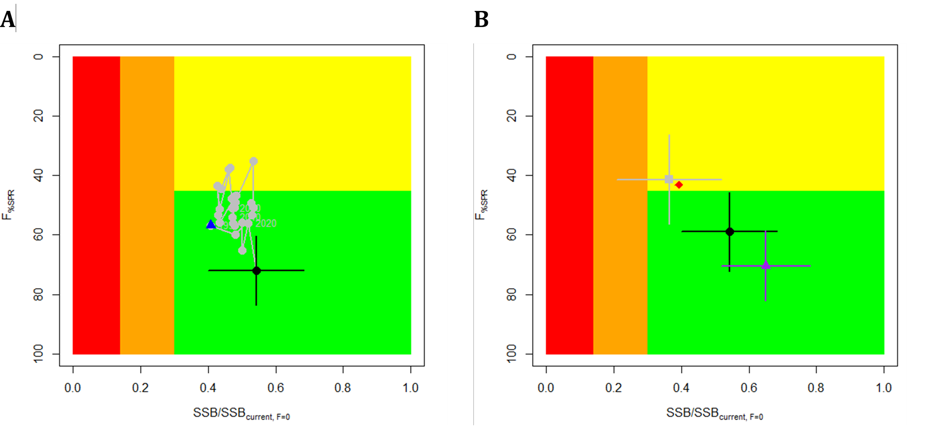 Stock status is depicted in relation to the target (F45%SPR), threshold (30%SSBcurrent, F=0), and limit (14%SSBcurrent, F=0) reference points (Figure 5A – the “La Jolla” plot; Table 1). The estimated female SSB has never fallen below the threshold and limit reference points since 1994, albeit with large uncertainty in the terminal year (2021) estimates. However, the estimated fishing intensity for five years (1999, 2002, 2003, 2004, and 2007) exceeded the target reference point. Even when alternative hypotheses about key model uncertainties such as growth were evaluated, the point estimate of female SSB in 2021 (SSB2021) did not fall below the threshold and limit reference points, although the risk increases with the more extreme assumption (Figure 5B). In contrast, estimated average fishing intensity during 2018-2020 (F2018-2020) did exceed the target reference point under one of these alternative hypotheses but did not exceed the average fishing intensity during the 2002-2004 period (Figure 5B; Table 1).